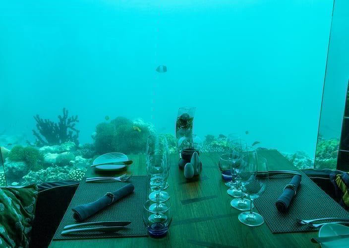 Restauranten Under ligger fem meter under havet og har et kjempestort vindu hvor du kan se på fisk, maneter og annet liv i sjøen mens du spiser deilig sjømat.