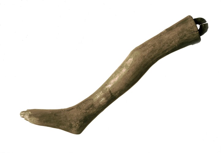 En gang i middelalderen fikk noen laget en etterlikning av beinet sitt. Trebeinet på bildet er bare tjue centimeter langt, og siden det har en hempe, tror vi at vedkommende hengte det rundt halsen. Men det var ikke ment som pynt. Beinet var en slags offergave. Vedkommende hadde nok et vondt bein og ønsket at det skulle bli friskt.