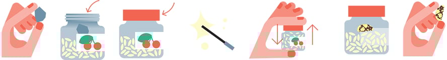 - Skru av lokket på syltetøyglasset og vis frem nøtta til publikum. For dem vil det se ut som om du har forvandlet steinen til en nøtt.