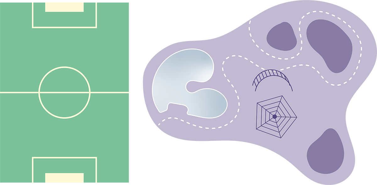 - Det er litt ulike typar område med ulik storleik slik at du kan velje om du vil leike, klatre, spele fotball eller berre sitje i ein krok og snakke med vennene dine.